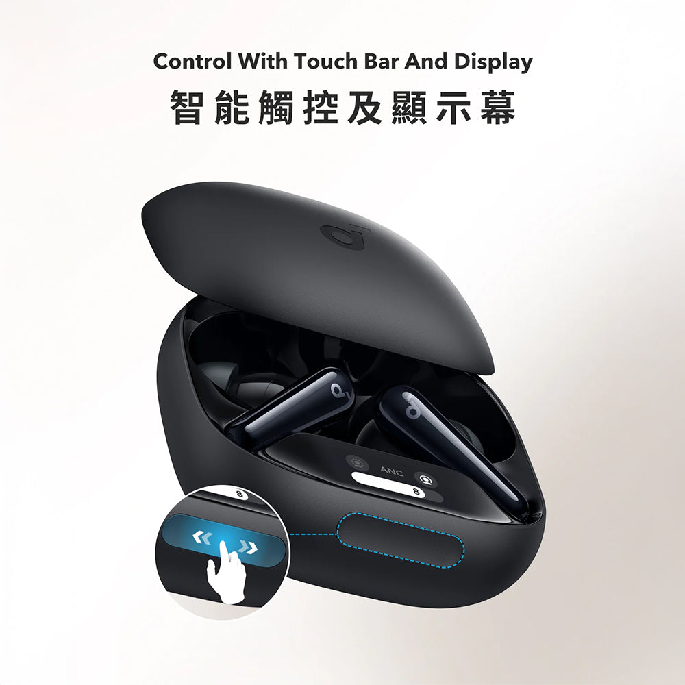 充電盒的搭載了觸控條與顯示屏,只需滑動即可輕鬆調整降噪強度,並可隨時查看電量資訊。亮面款色更可於盒蓋關閉時查看充電盒內顯示屏。
