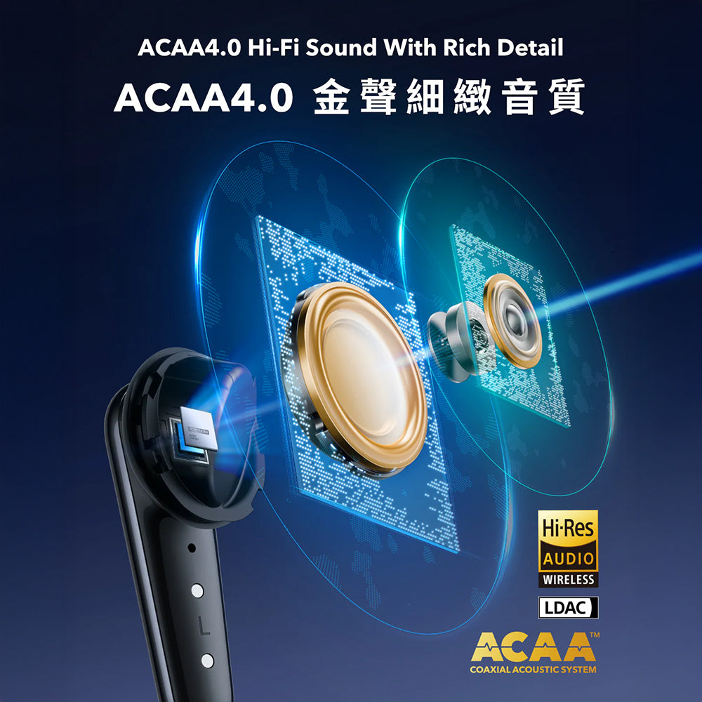承繼soundcore的同軸雙單元聲樂設計,採用 10.5 mm 低音單元與 4.6 mm 鈦合金高音單元,結合雙通道音頻技術(digital crossover technology),明確響出高保真、無渲染的音色。Hi-Res Wireless 認證,對應LDAC高音質的音訊傳輸技術,重現音樂細節。