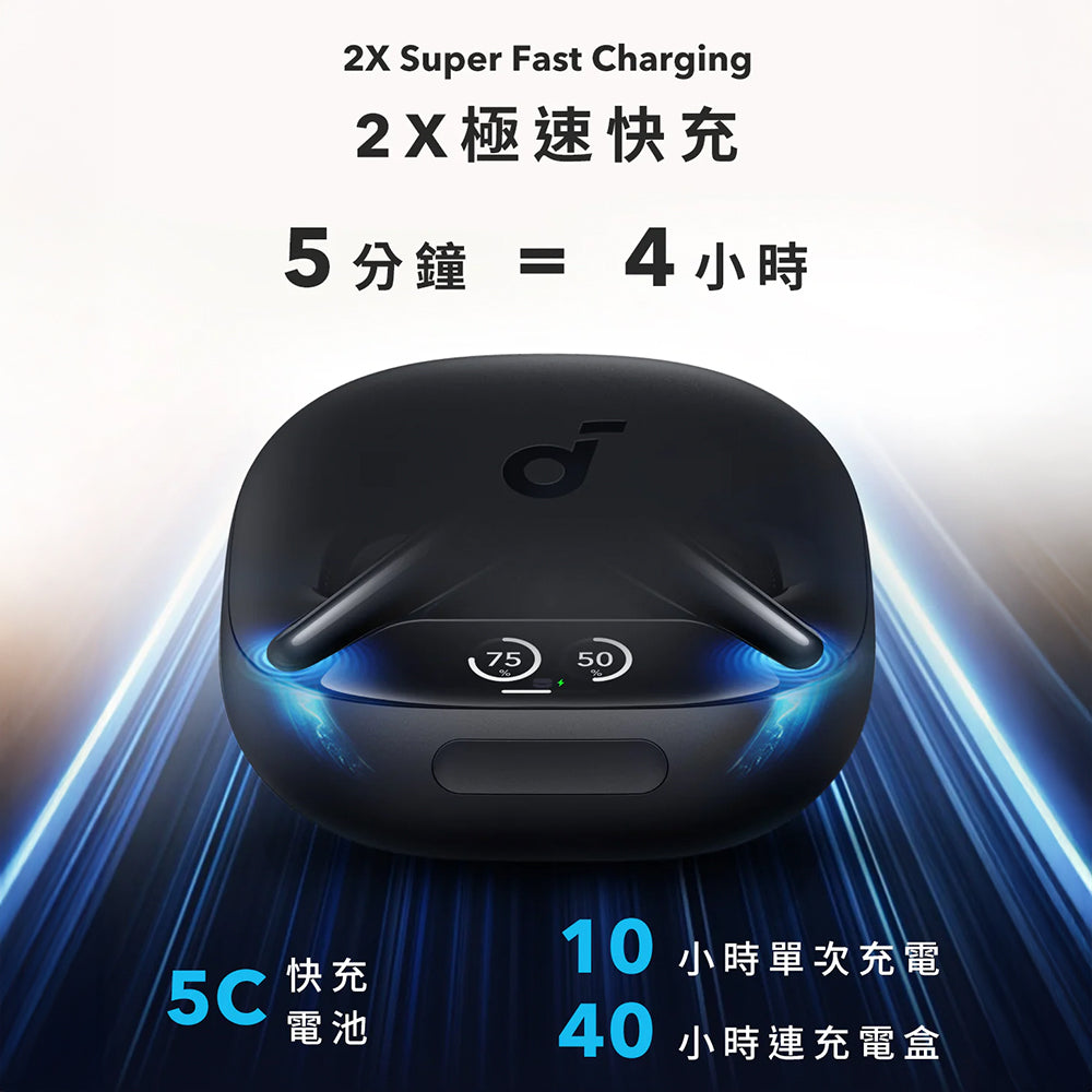 採用 5C 快充電池,耳機只需放入在充電盒充電 5 分鐘,即可提供長達 4 小時的音樂播放時間。耳機單次充滿電,在關閉ANC模式下可最長使用 10 小時,連充電盒總共可使用 40 小時;啟動ANC模式時,耳機可使用最長 7.5 小時,連充電盒則總共可使用最長 30 小時。